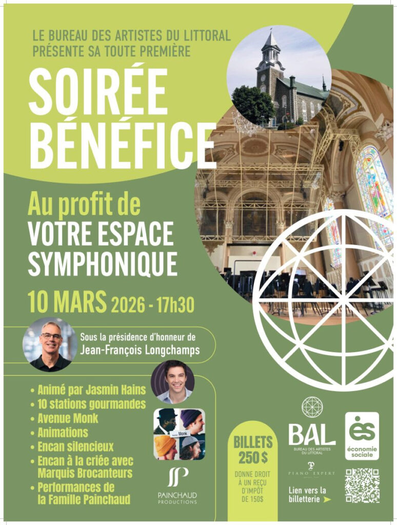 Pensée comme un geste concret en faveur du patrimoine et du développement culturel régional, la soirée du 10 mars proposera une expérience immersive mêlant gastronomie, arts du cirque et musique. Les invités pourront assister à des performances de la Famille Painchaud, à une prestation jazz d’Avenue Monk en hommage à Thelonious Monk, ainsi qu’à une performance du DJ Eric Hauser. Animations surprises, encans silencieux et à la criée, stations gourmandes et présentation de la vision du futur espace symphonique ponctueront également la soirée.